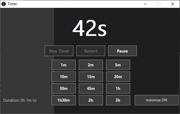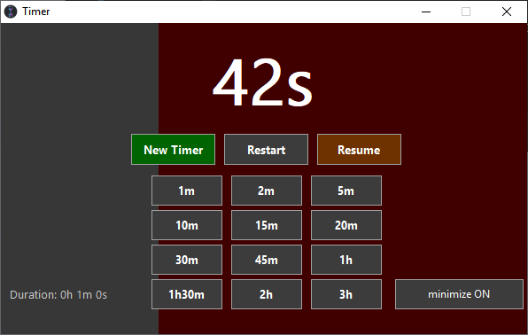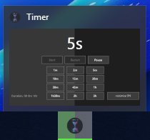 Features a taskbar progress indicator, it switches to red when the timer is over. The timer does not play any sound. The taskbar hover image is not updated when the application is minimized, the progress bar is updated.